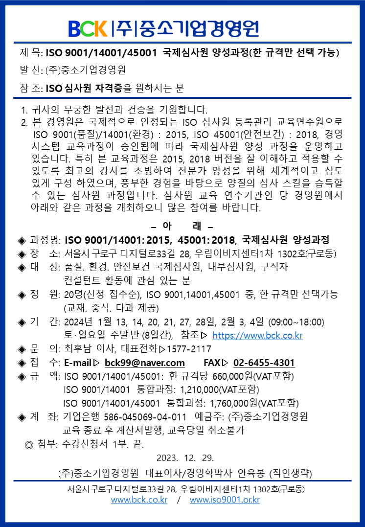 [종료]ISO 국제심사원 양성과정 신청